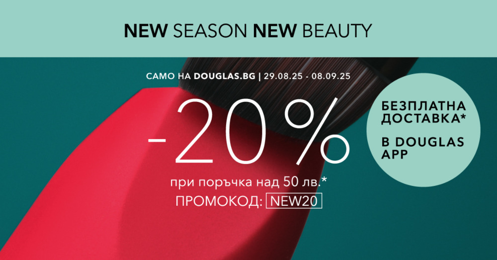 » Необходимо е да въведете промокод NEW20 на douglas.bg и в Douglas APP, ако сумата в кошницата е равна или по-голяма от 50 лв. / 25.56 €.