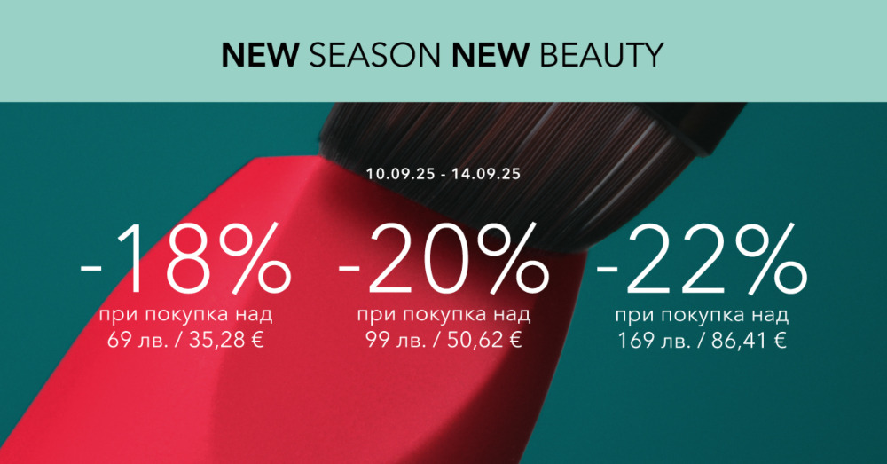 » Отстъпката е в размер на -18% при покупки на стойност на или над 69 лв. / 35.28 €, -20% при покупки на стойност на или над 99 лв. / 50.62 € и -22% при покупки на или над 169 лв. / 86.41 €. Преди изчисляване на отстъпката, от общата стойност на поръчката автоматично се изключва стойността на продуктите, които не са включени в промоцията.