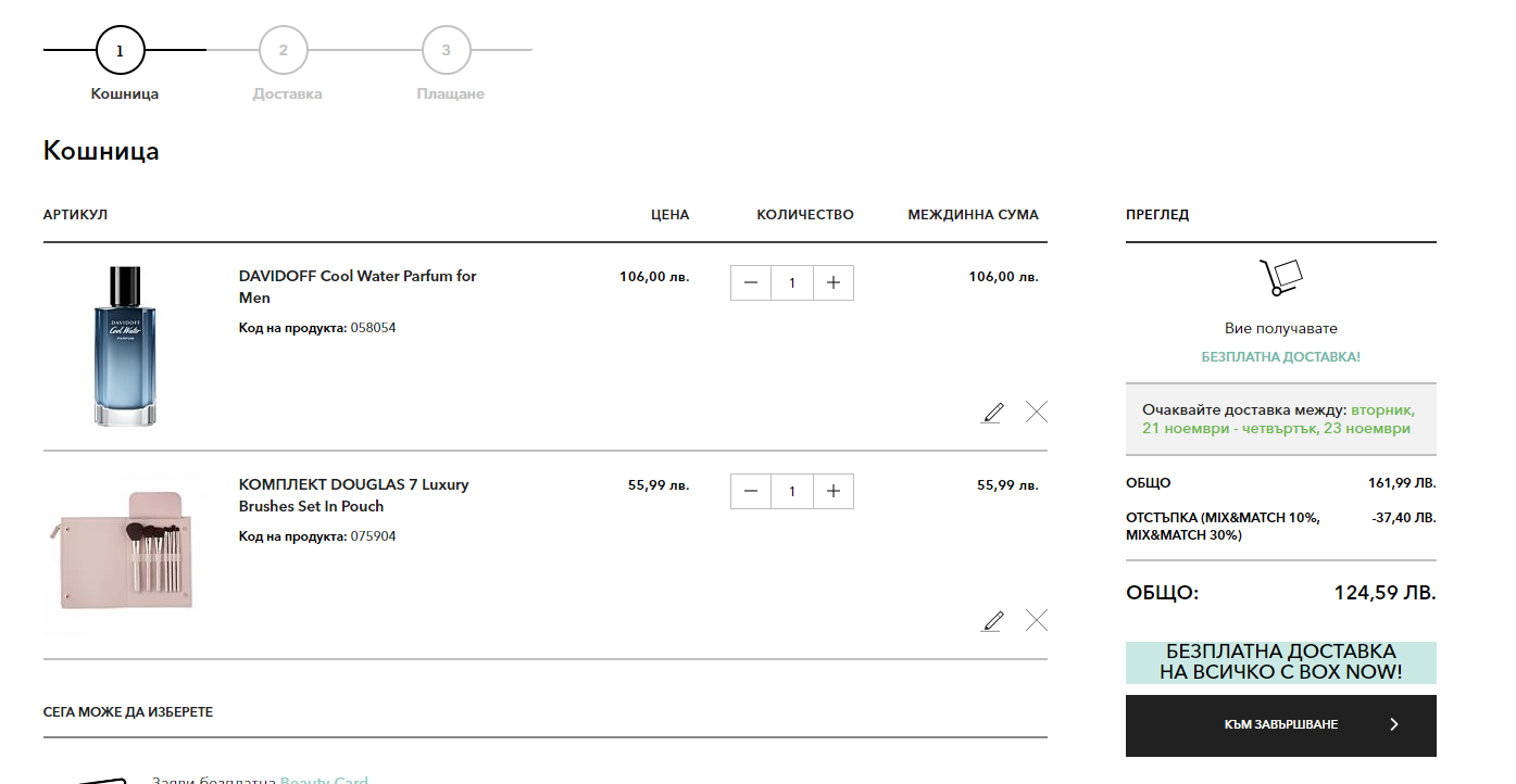 Пример: При добавяне на 1 продукт от страницата -30% на избрани продукти (Davidoff Cool Water) и 1 продукт от страницата -10% на избрани продукти (Douglas 7 Luxury Bushes set), получавате -30% отстъпка от редовната цена на продукта отбелязан с етикет (31,80 лв.) и -10% от редовната цена на продукта отбелязан с етикет