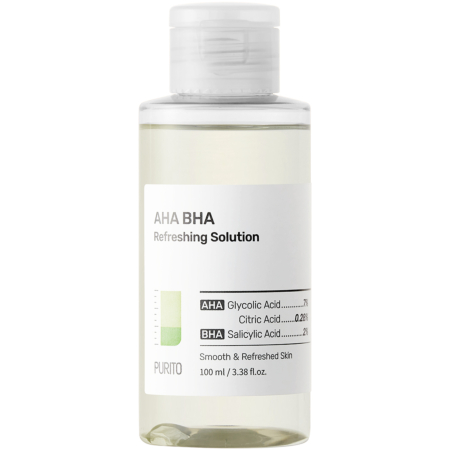 Purito AHA BHA Refreshing Solution е перфектното решение за ексфолиране на кожата. Редовното ексфолиране с Purito AHA BHA Refreshing Solution укрепва кожата и ѝ придава здравословен блясък.